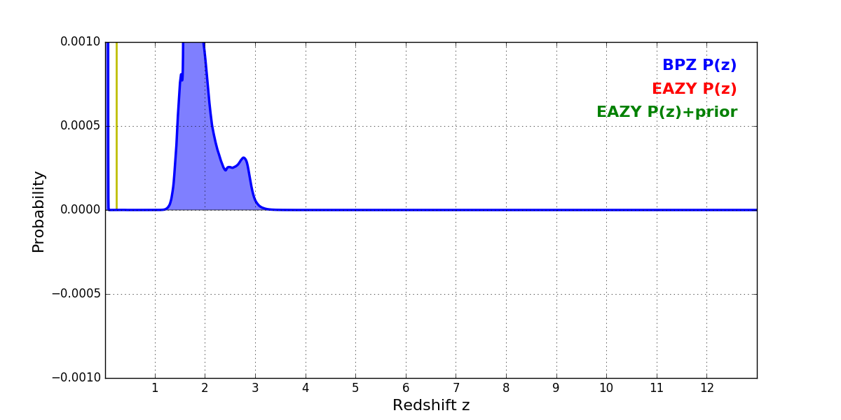In P(z) plots: Yellow lines mark the cluster redshift z = 0.228,