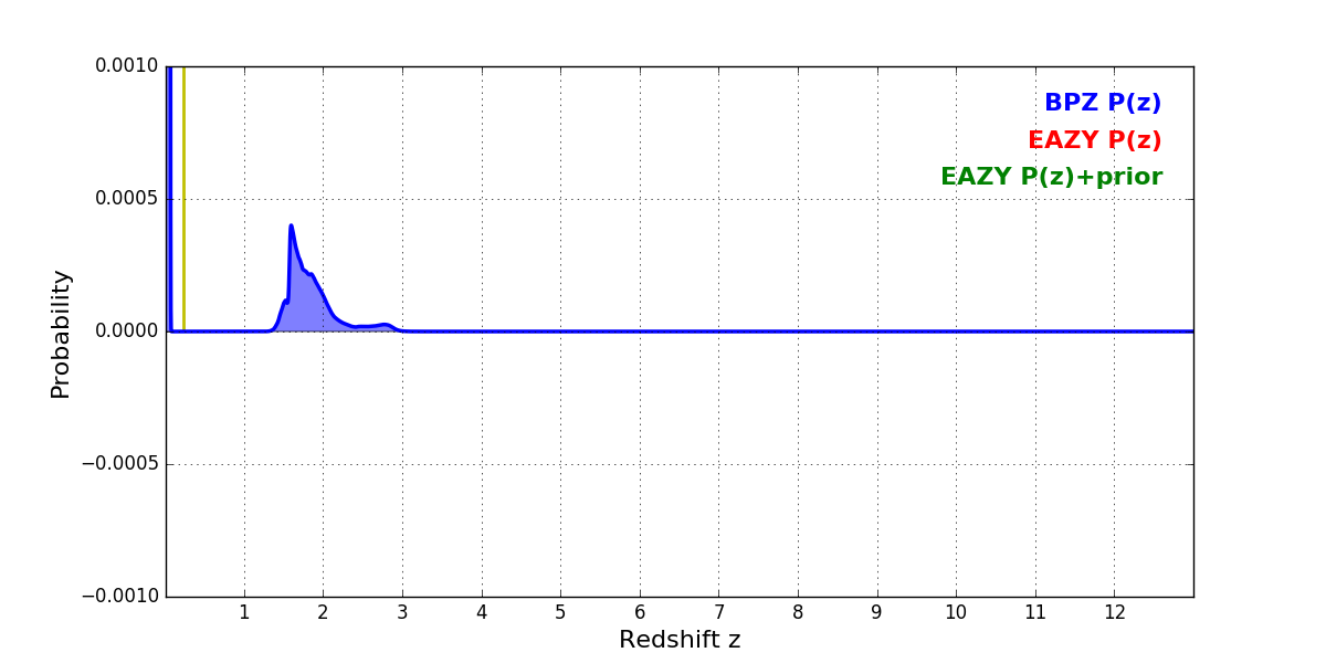 In P(z) plots: Yellow lines mark the cluster redshift z = 0.228,