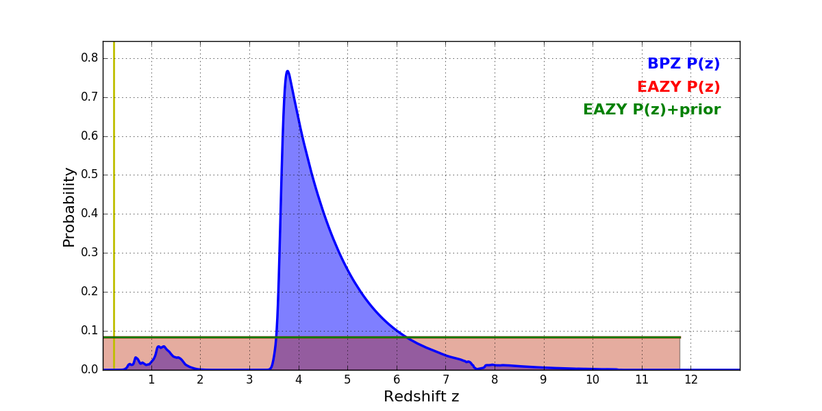 In P(z) plots: Yellow lines mark the cluster redshift z = 0.228,