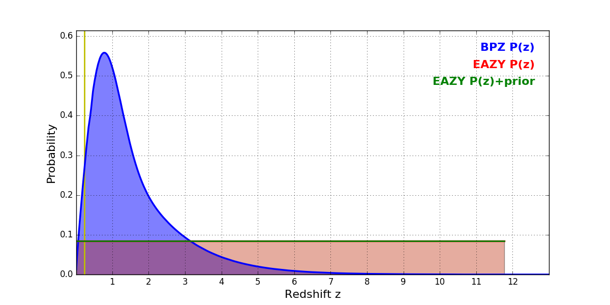 In P(z) plots: Yellow lines mark the cluster redshift z = 0.228,