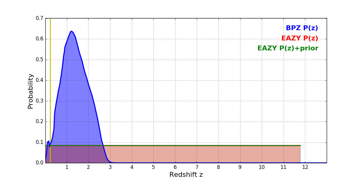 In P(z) plots: Yellow lines mark the cluster redshift z = 0.228,