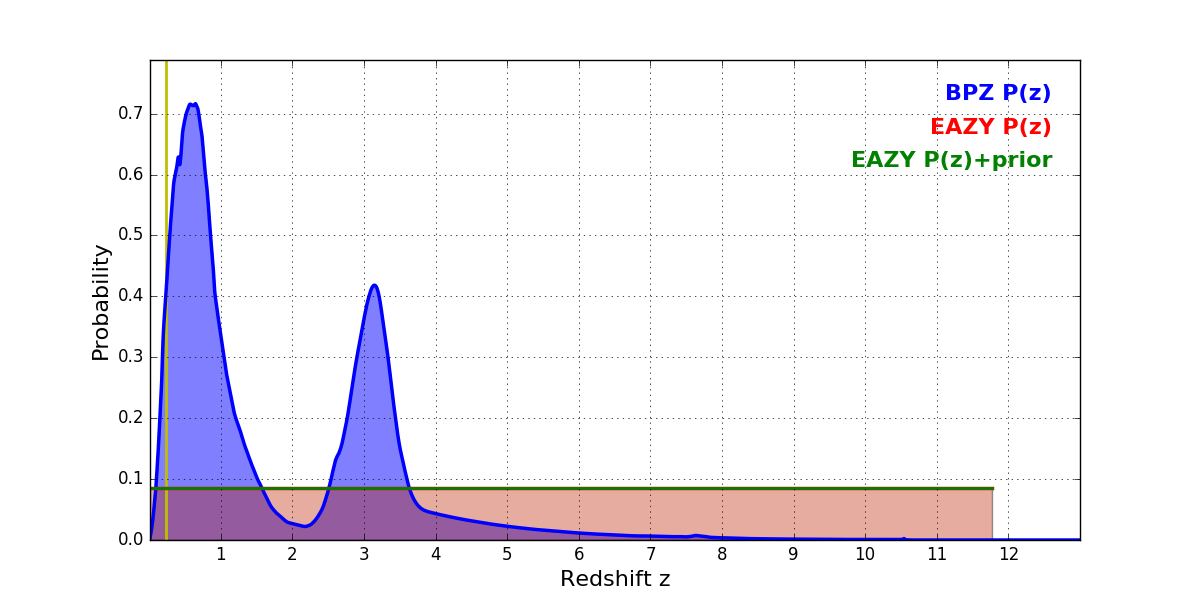 In P(z) plots: Yellow lines mark the cluster redshift z = 0.228,
