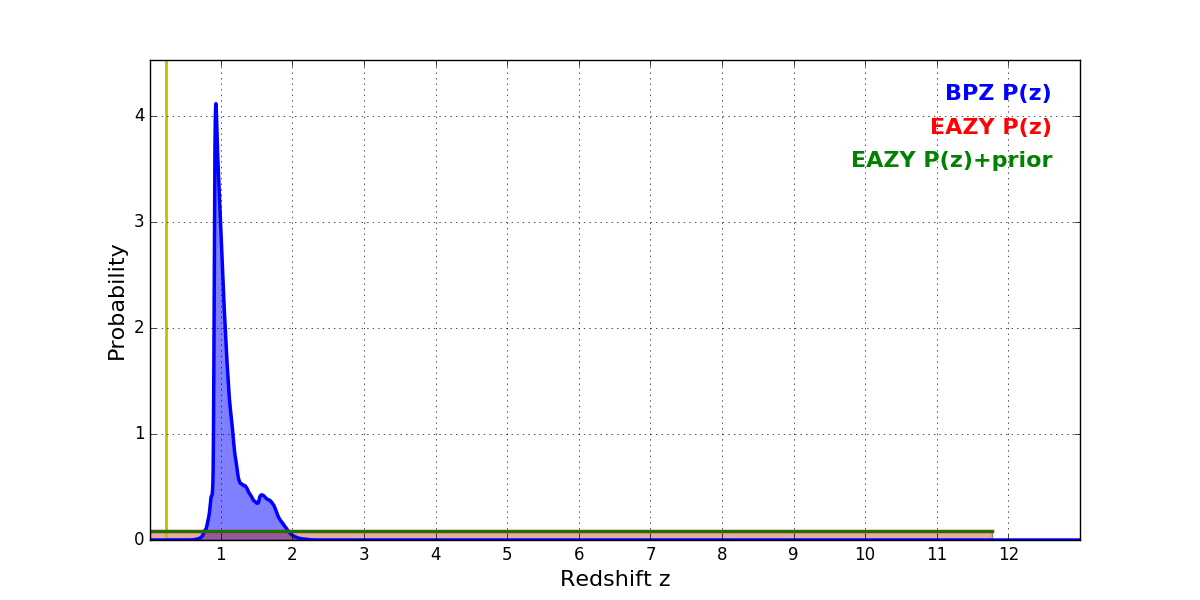 In P(z) plots: Yellow lines mark the cluster redshift z = 0.228,