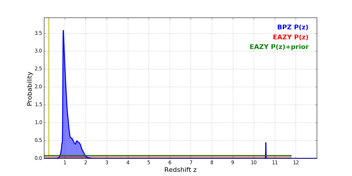 In P(z) plots: Yellow lines mark the cluster redshift z = 0.228,