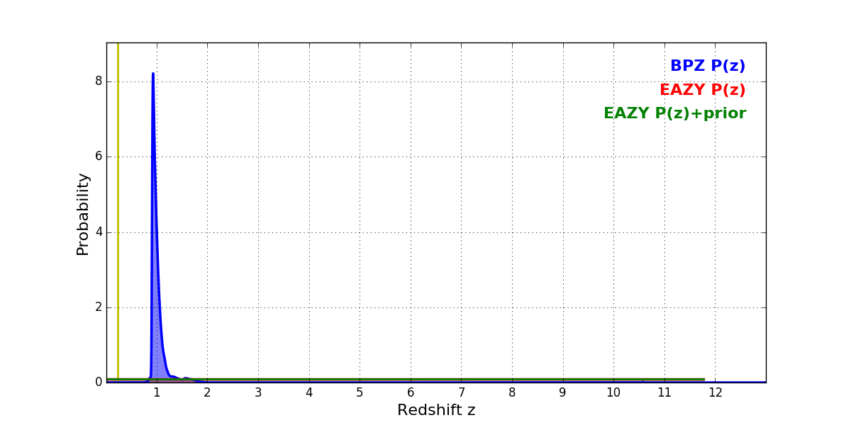 In P(z) plots: Yellow lines mark the cluster redshift z = 0.228,