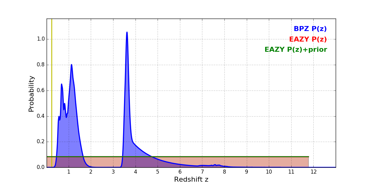 In P(z) plots: Yellow lines mark the cluster redshift z = 0.228,