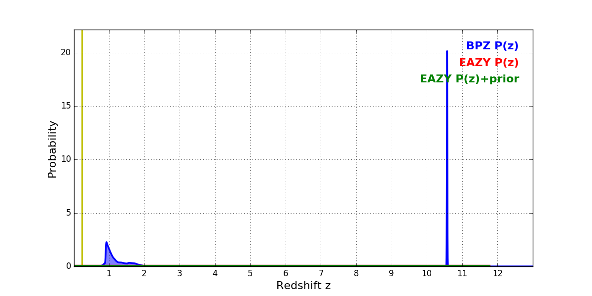 In P(z) plots: Yellow lines mark the cluster redshift z = 0.228,