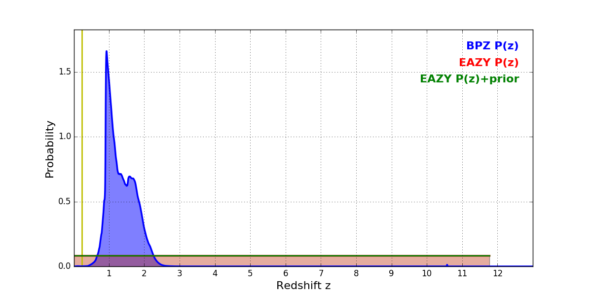 In P(z) plots: Yellow lines mark the cluster redshift z = 0.228,