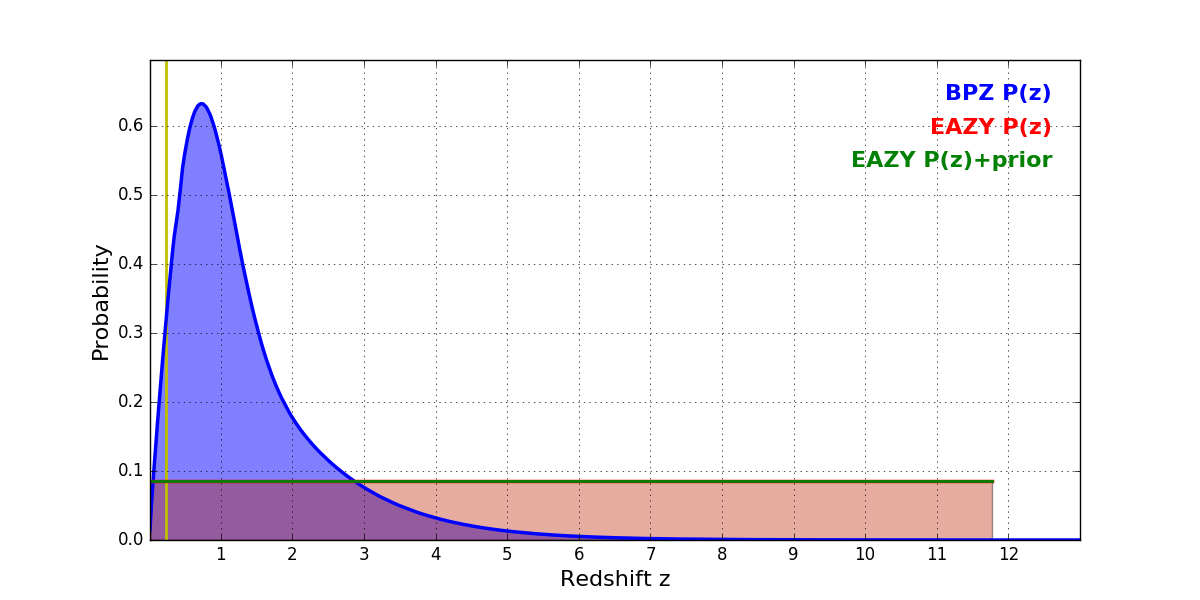 In P(z) plots: Yellow lines mark the cluster redshift z = 0.228,
