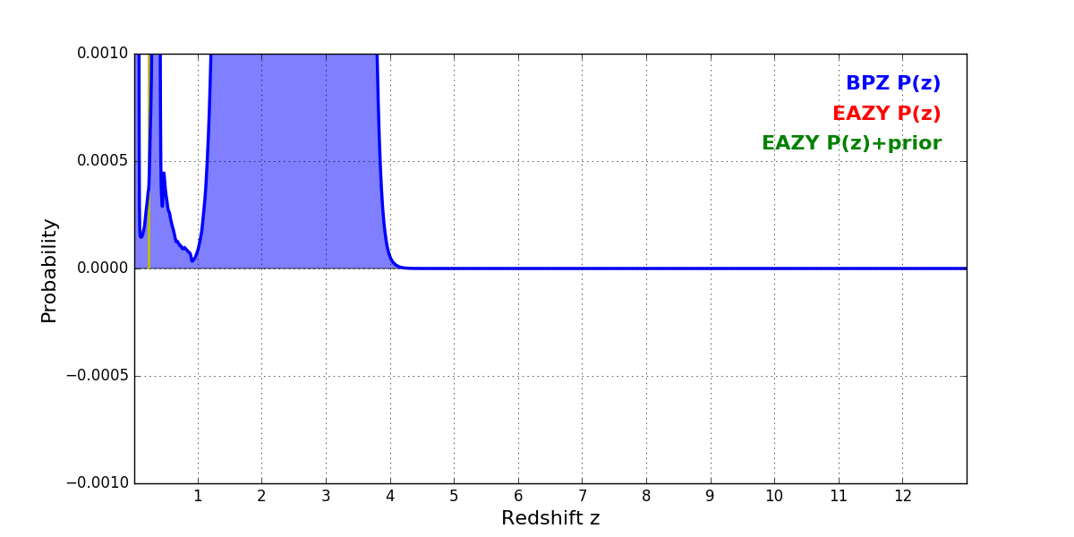In P(z) plots: Yellow lines mark the cluster redshift z = 0.228,