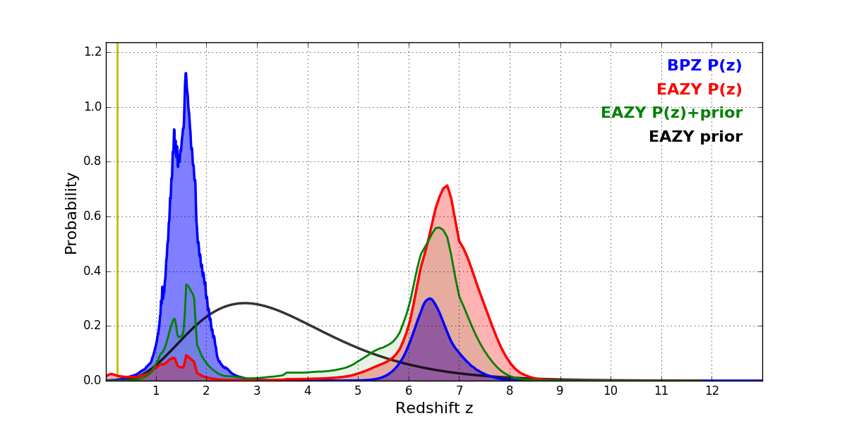 In P(z) plots: Yellow lines mark the cluster redshift z = 0.228,