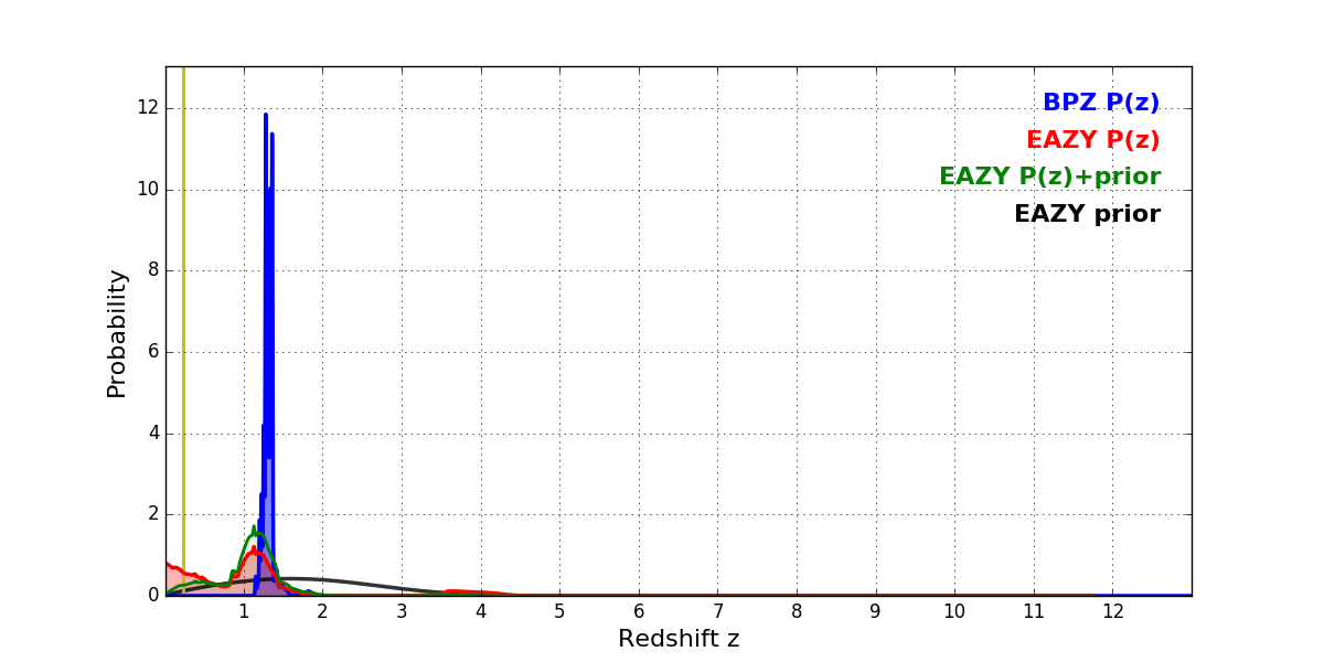 In P(z) plots: Yellow lines mark the cluster redshift z = 0.228,