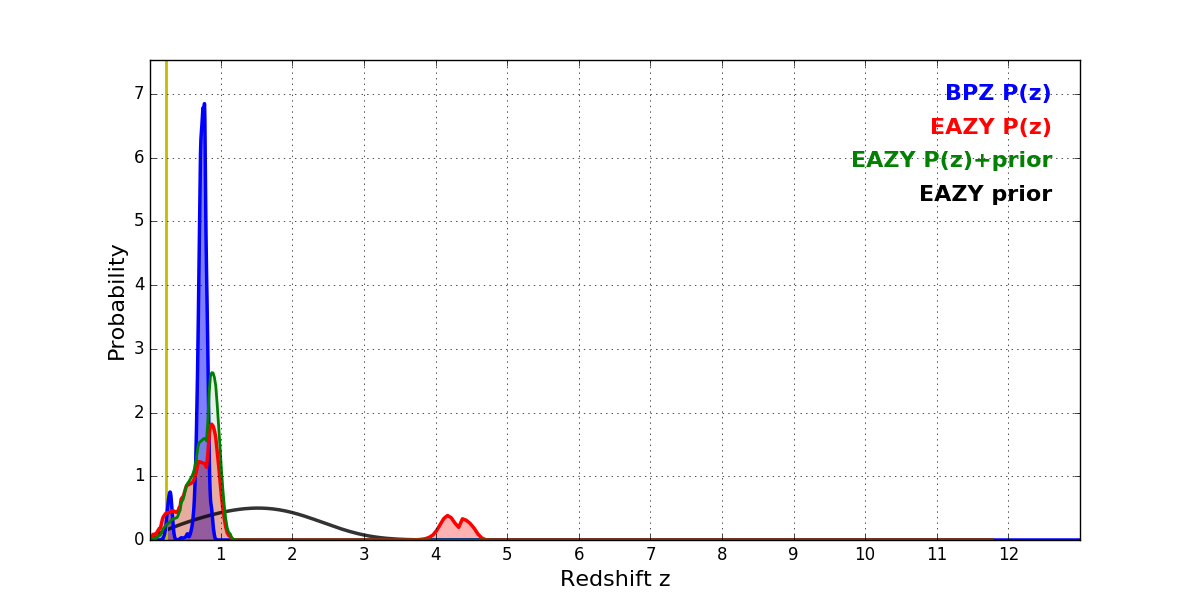 In P(z) plots: Yellow lines mark the cluster redshift z = 0.228,