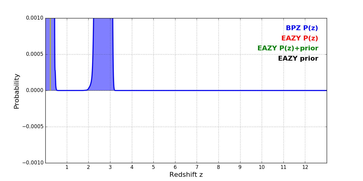 In P(z) plots: Yellow lines mark the cluster redshift z = 0.228,
