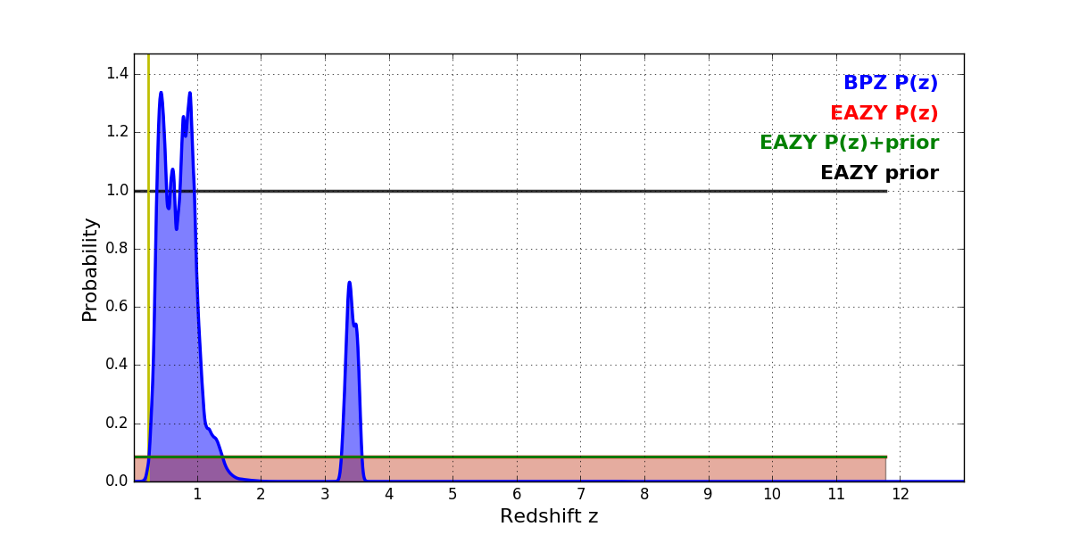 In P(z) plots: Yellow lines mark the cluster redshift z = 0.228,