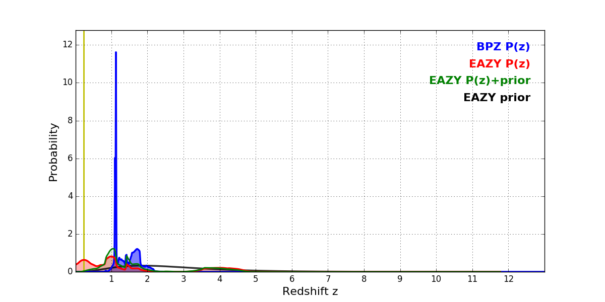 In P(z) plots: Yellow lines mark the cluster redshift z = 0.228,