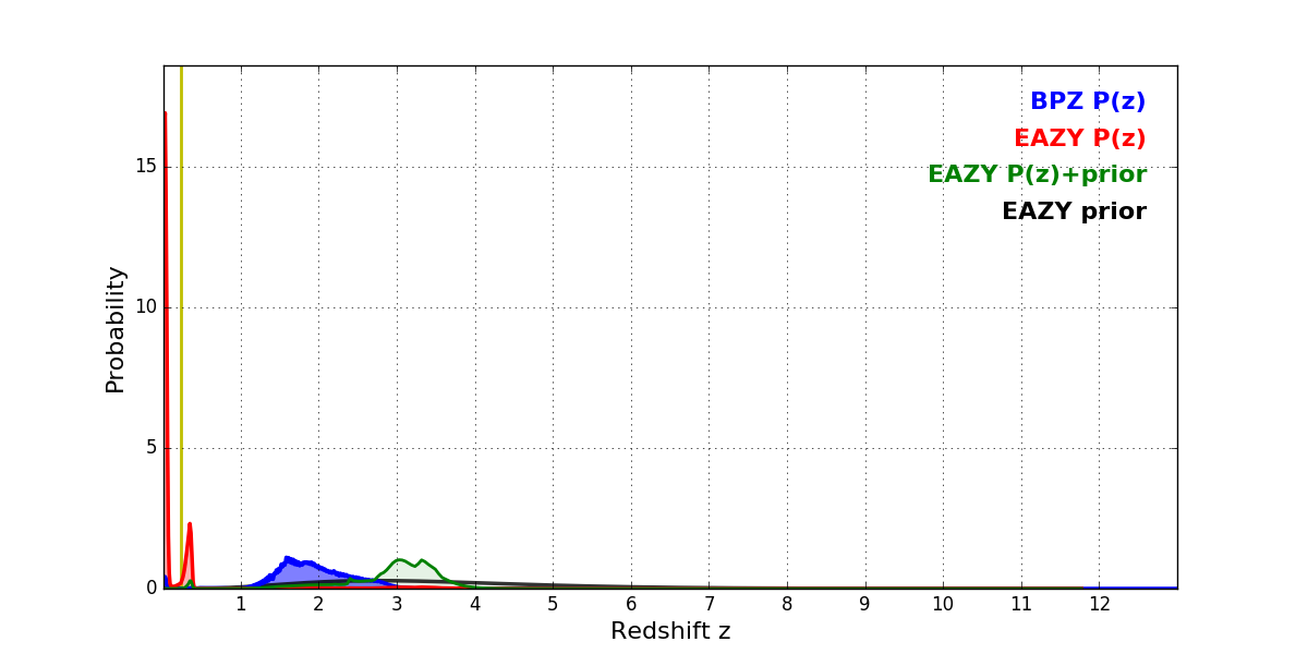 In P(z) plots: Yellow lines mark the cluster redshift z = 0.228,