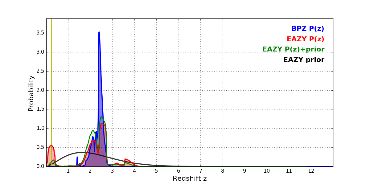 In P(z) plots: Yellow lines mark the cluster redshift z = 0.228,