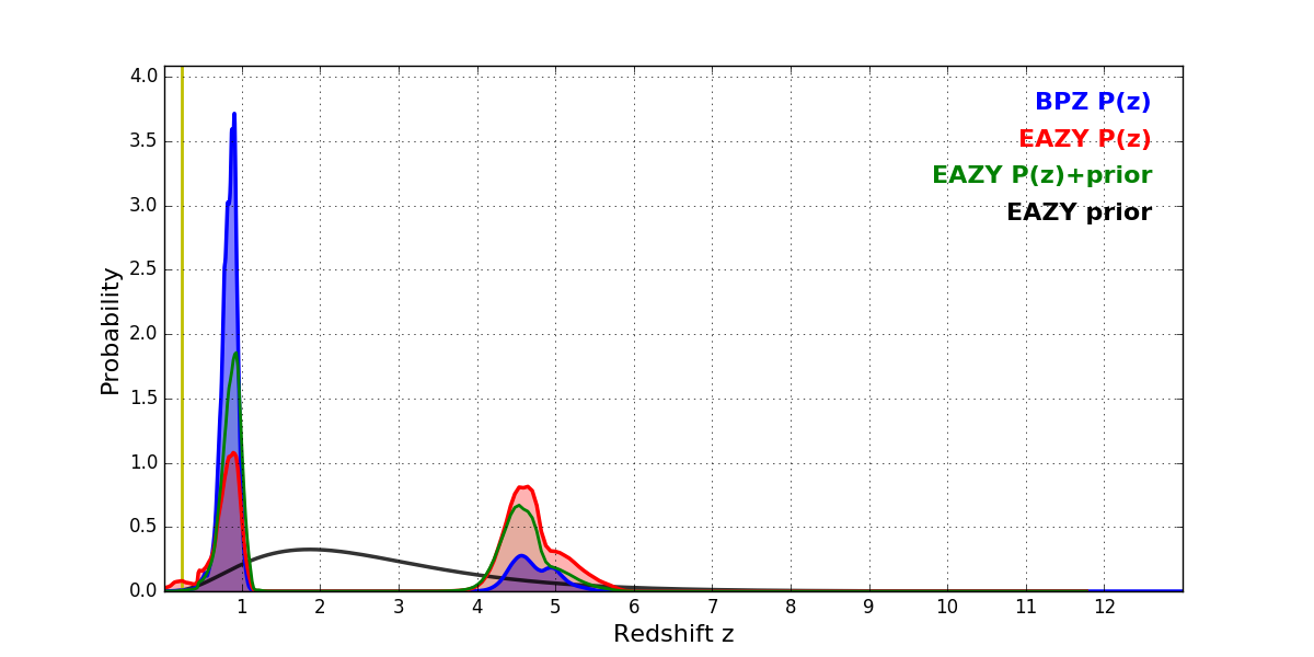 In P(z) plots: Yellow lines mark the cluster redshift z = 0.228,