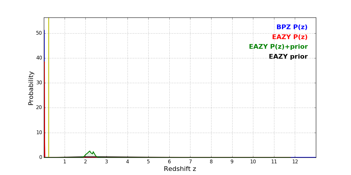 In P(z) plots: Yellow lines mark the cluster redshift z = 0.228,