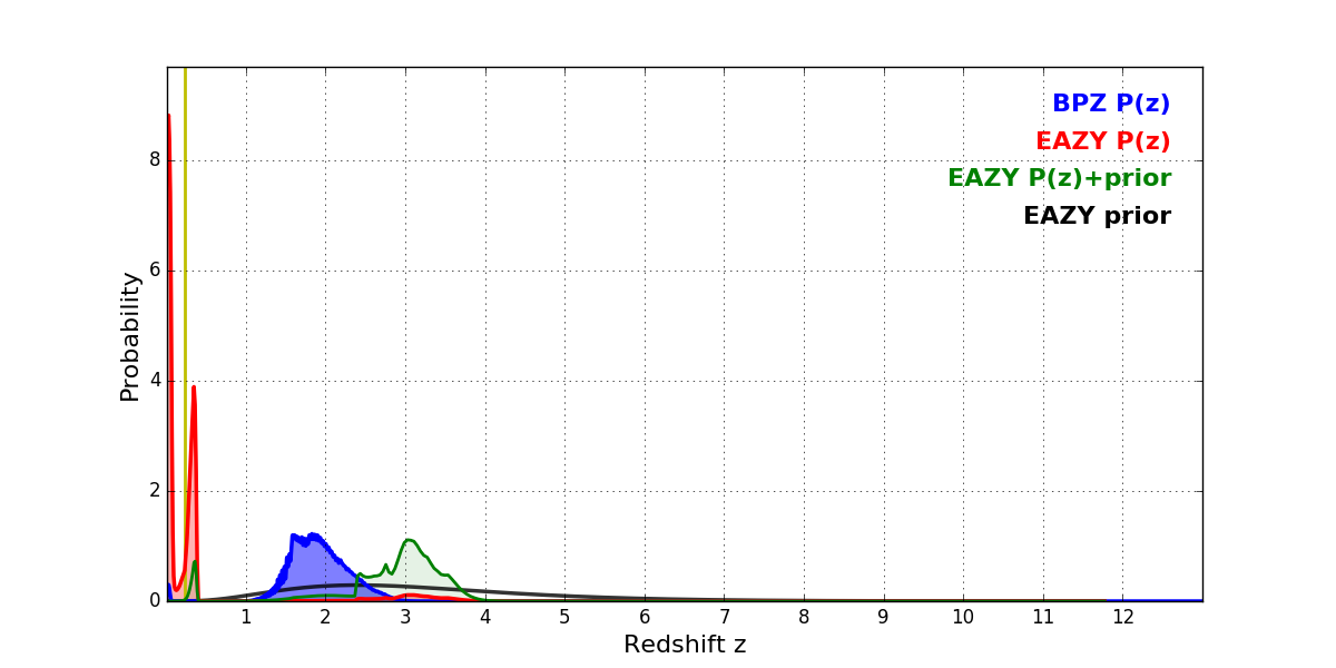 In P(z) plots: Yellow lines mark the cluster redshift z = 0.228,