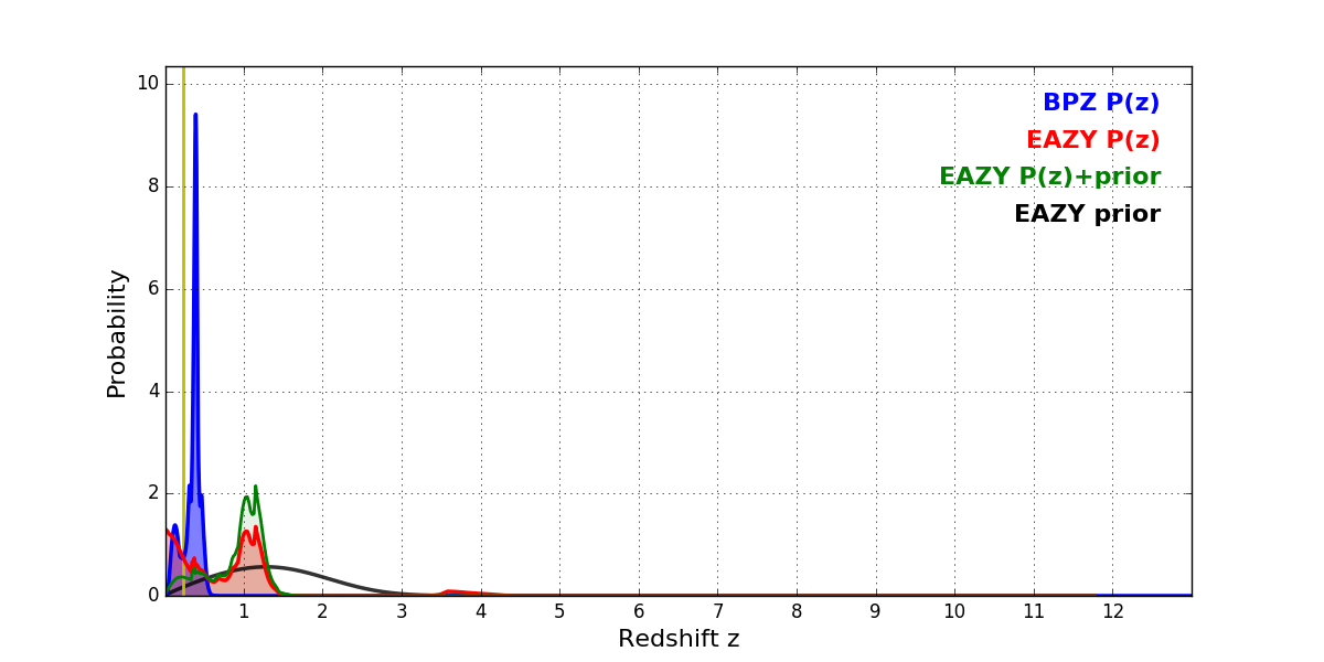 In P(z) plots: Yellow lines mark the cluster redshift z = 0.228,
