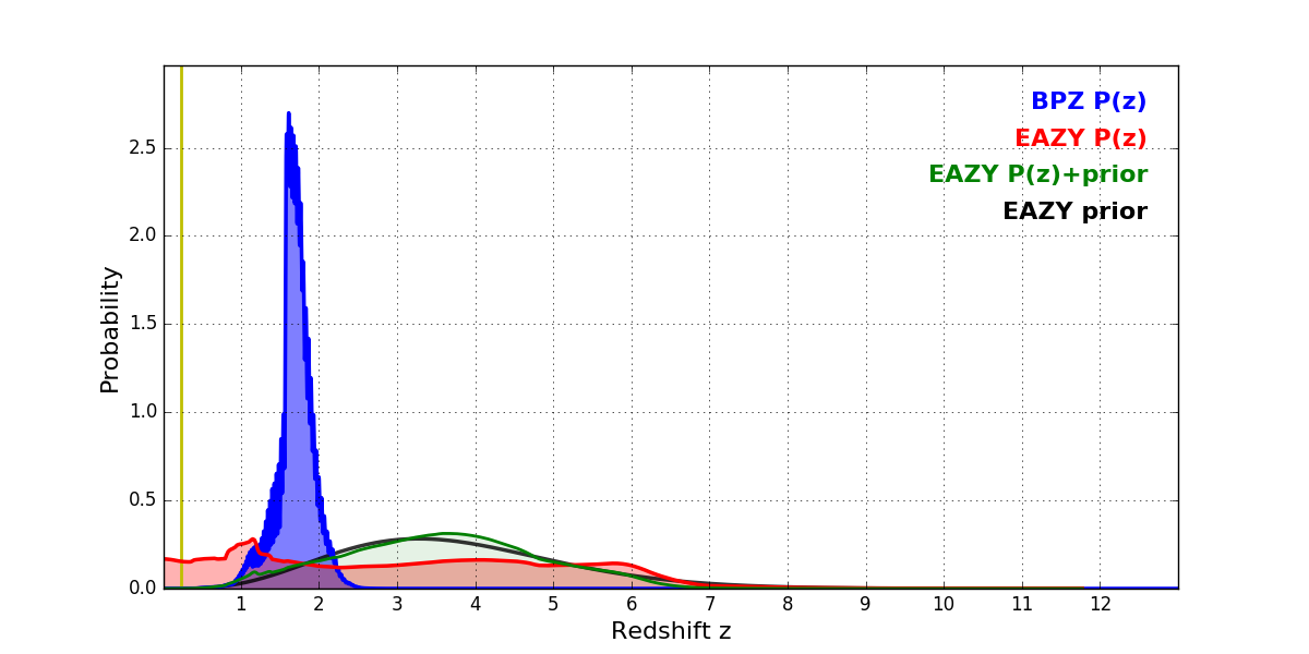 In P(z) plots: Yellow lines mark the cluster redshift z = 0.228,