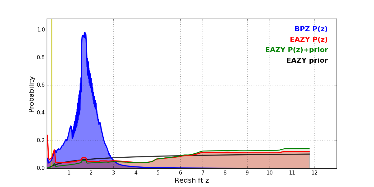 In P(z) plots: Yellow lines mark the cluster redshift z = 0.228,