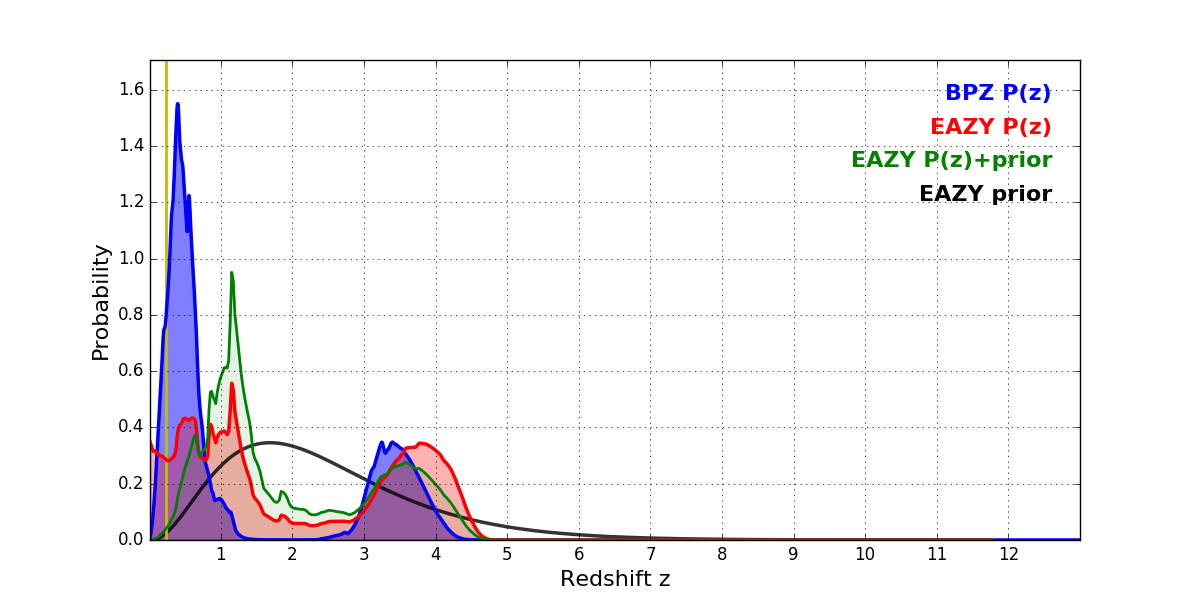In P(z) plots: Yellow lines mark the cluster redshift z = 0.228,