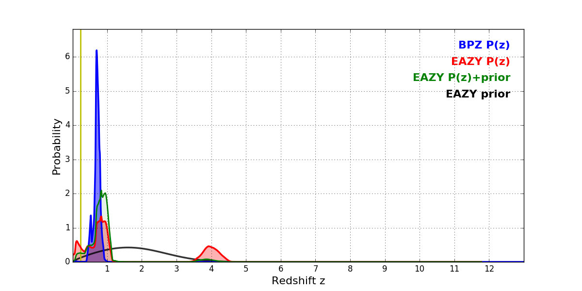 In P(z) plots: Yellow lines mark the cluster redshift z = 0.228,