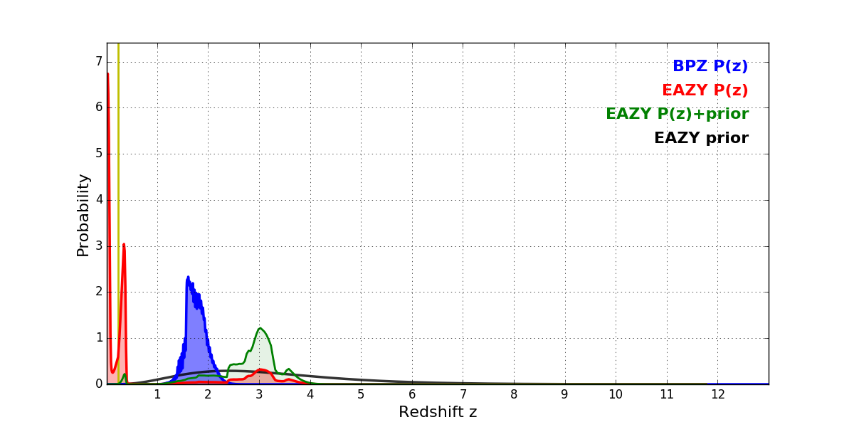 In P(z) plots: Yellow lines mark the cluster redshift z = 0.228,
