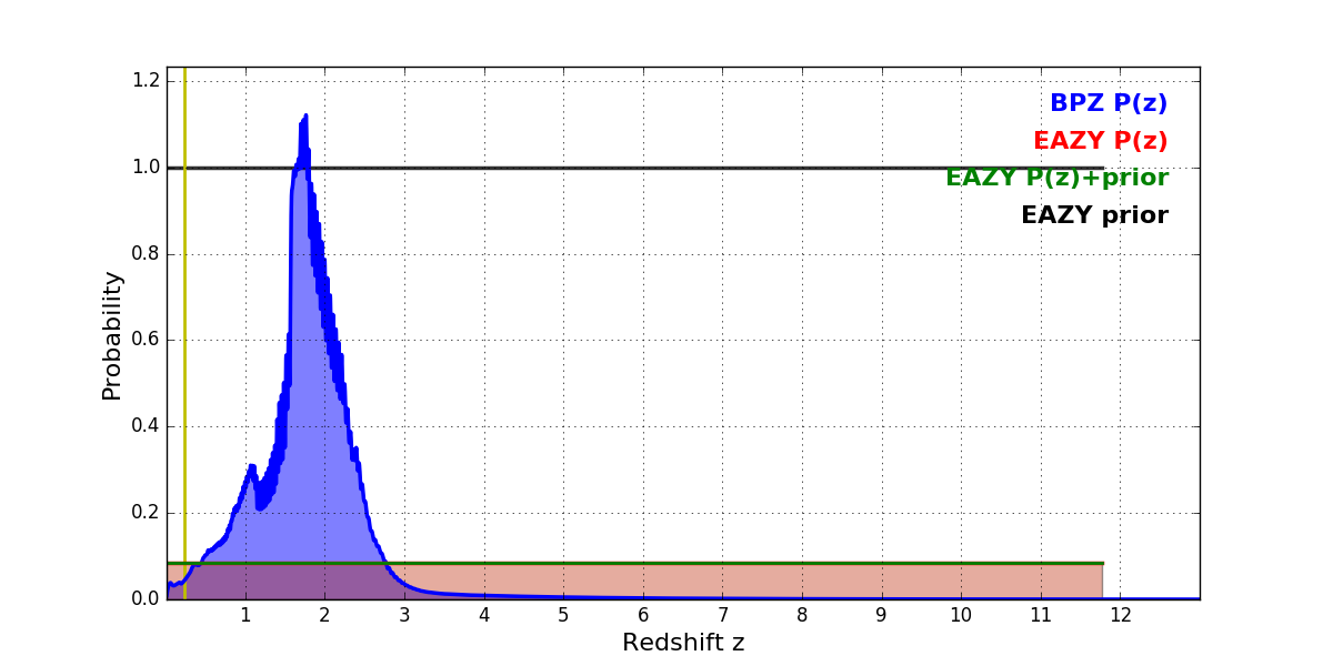 In P(z) plots: Yellow lines mark the cluster redshift z = 0.228,