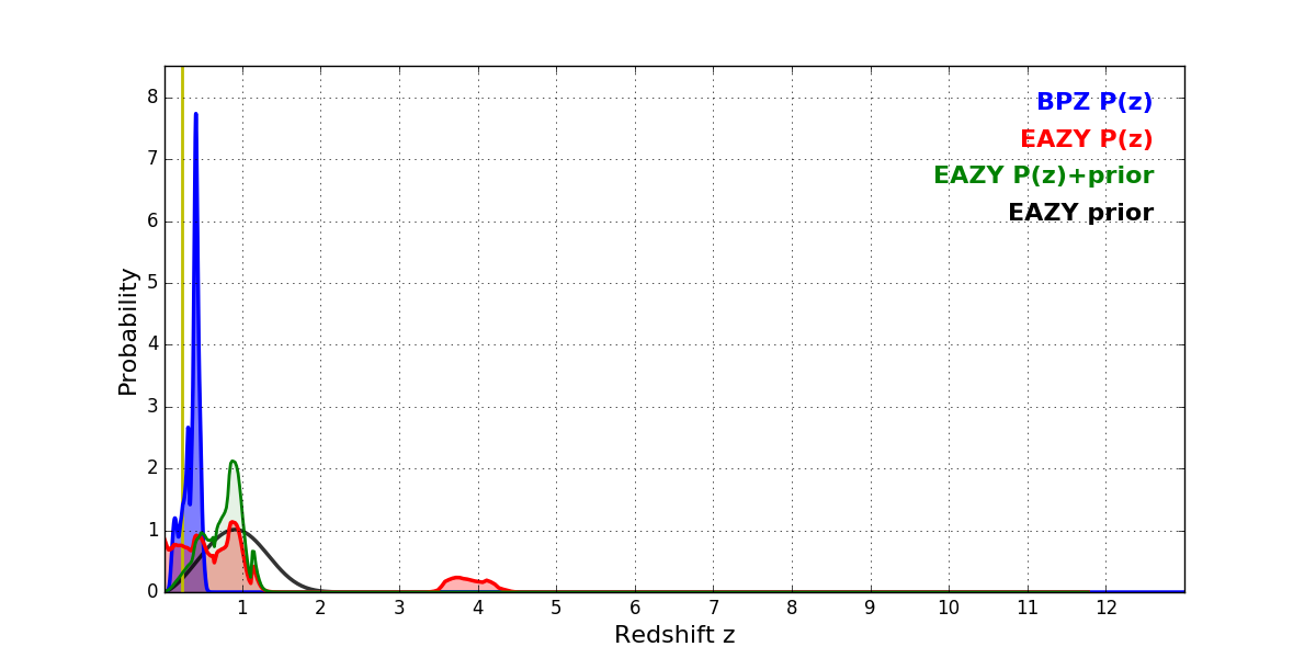In P(z) plots: Yellow lines mark the cluster redshift z = 0.228,