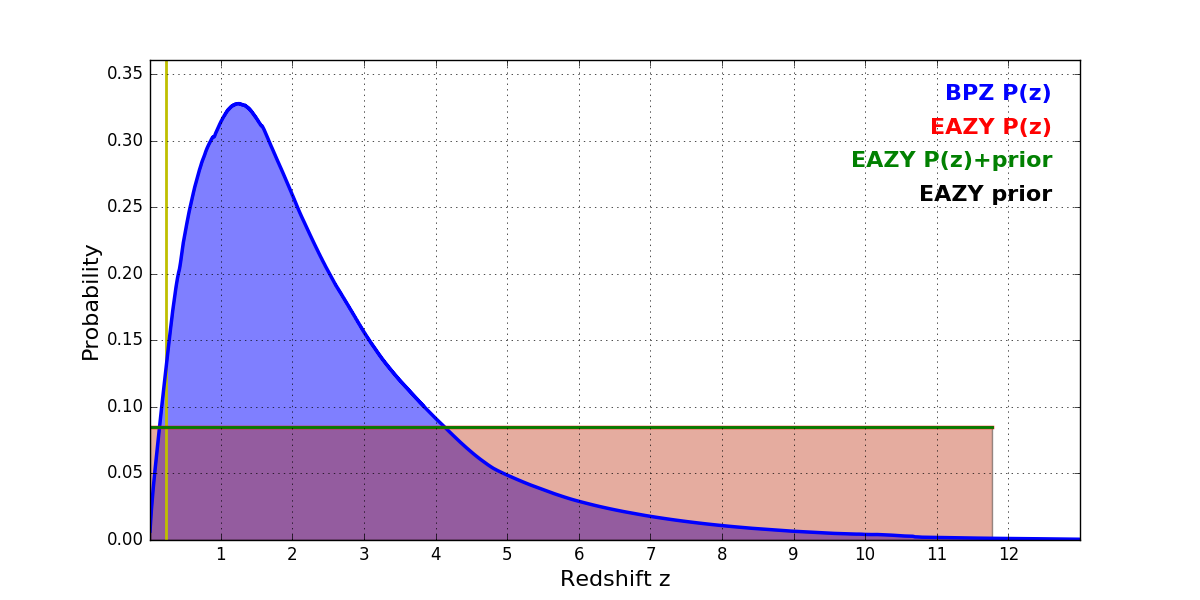 In P(z) plots: Yellow lines mark the cluster redshift z = 0.228,