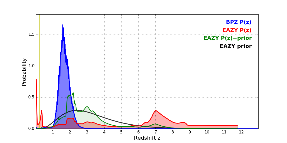 In P(z) plots: Yellow lines mark the cluster redshift z = 0.228,