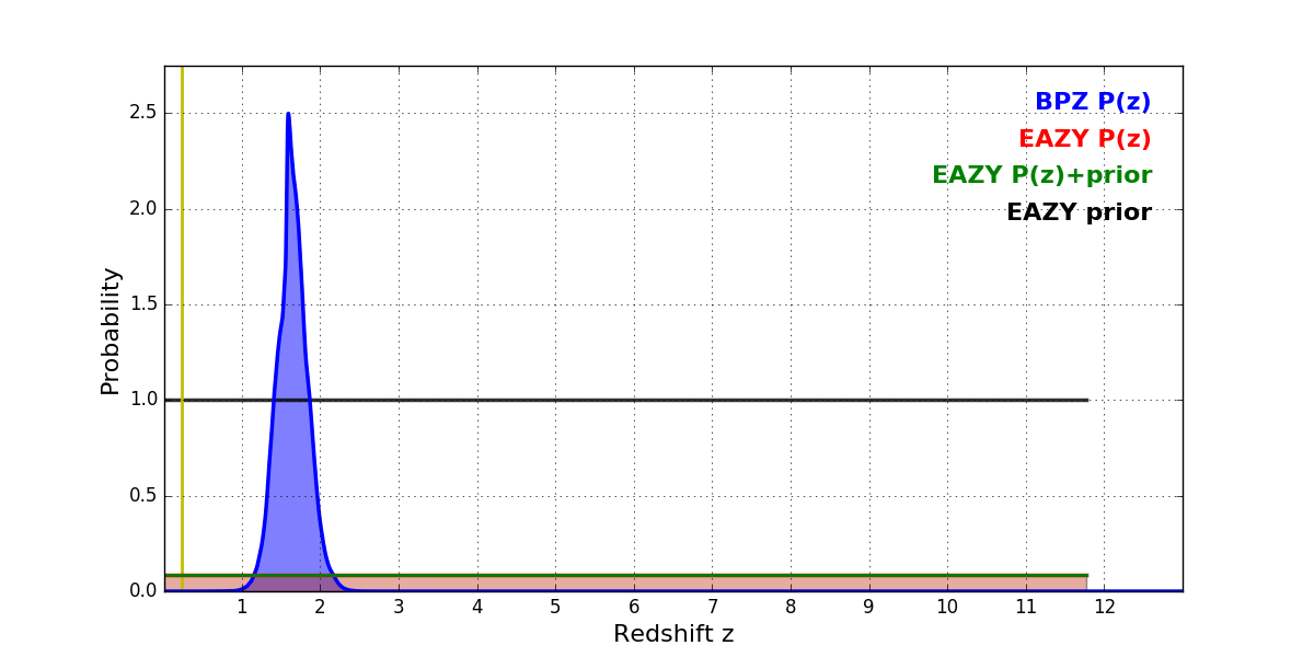 In P(z) plots: Yellow lines mark the cluster redshift z = 0.228,