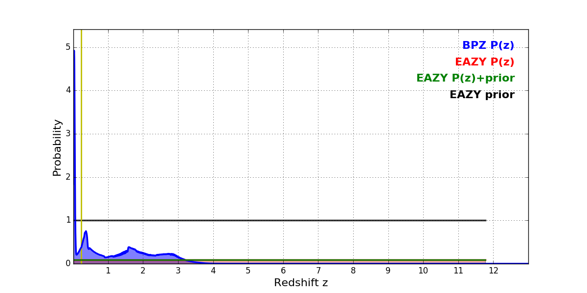 In P(z) plots: Yellow lines mark the cluster redshift z = 0.228,