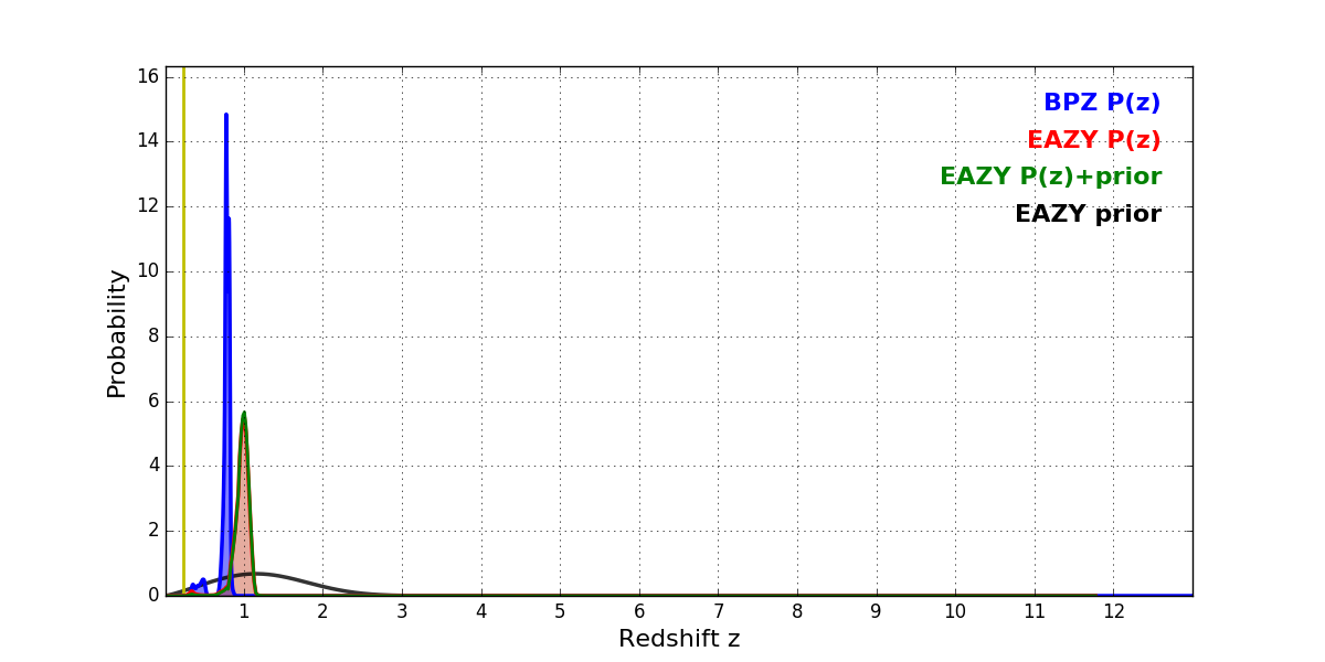 In P(z) plots: Yellow lines mark the cluster redshift z = 0.228,