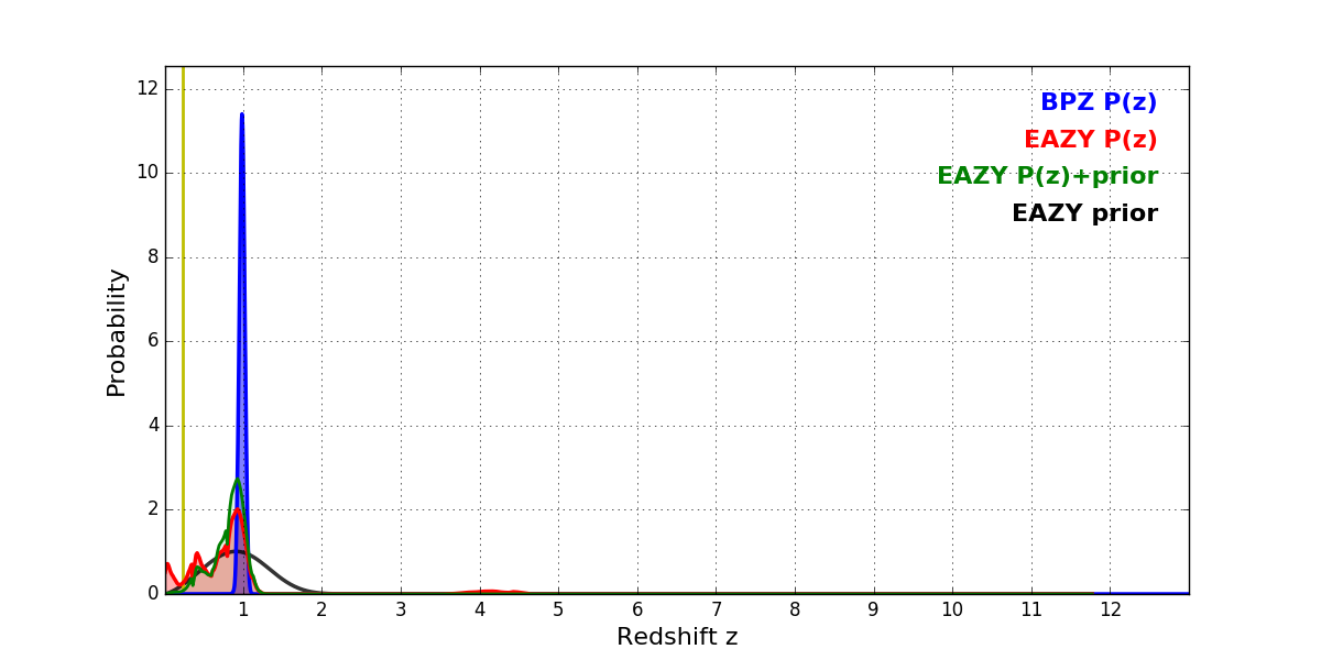 In P(z) plots: Yellow lines mark the cluster redshift z = 0.228,