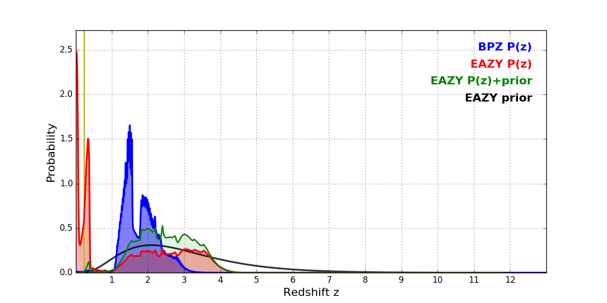In P(z) plots: Yellow lines mark the cluster redshift z = 0.228,
