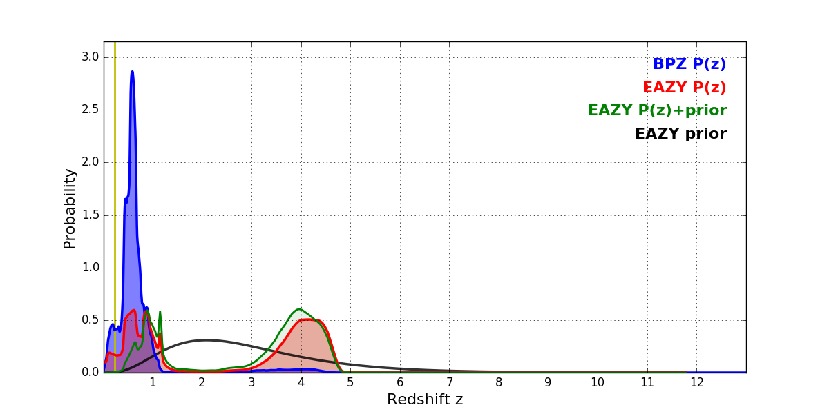 In P(z) plots: Yellow lines mark the cluster redshift z = 0.228,