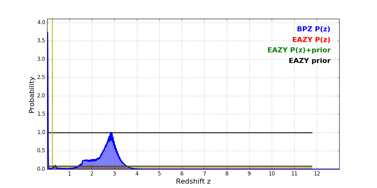 In P(z) plots: Yellow lines mark the cluster redshift z = 0.228,