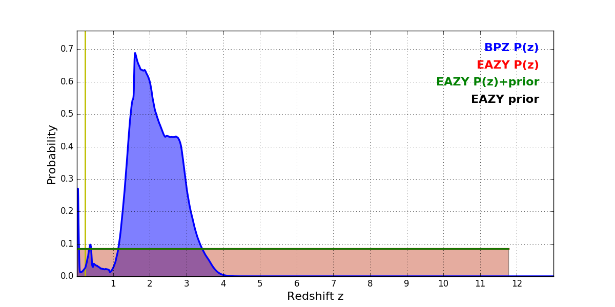 In P(z) plots: Yellow lines mark the cluster redshift z = 0.228,