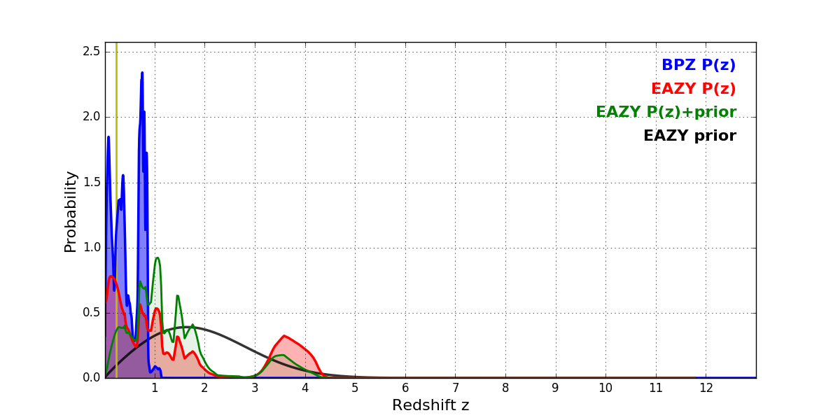 In P(z) plots: Yellow lines mark the cluster redshift z = 0.228,