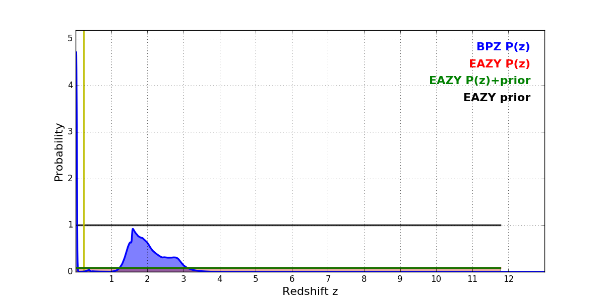 In P(z) plots: Yellow lines mark the cluster redshift z = 0.228,