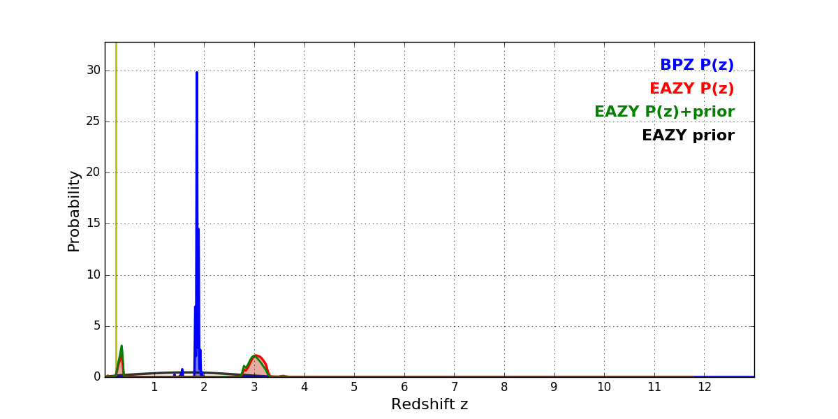 In P(z) plots: Yellow lines mark the cluster redshift z = 0.228,