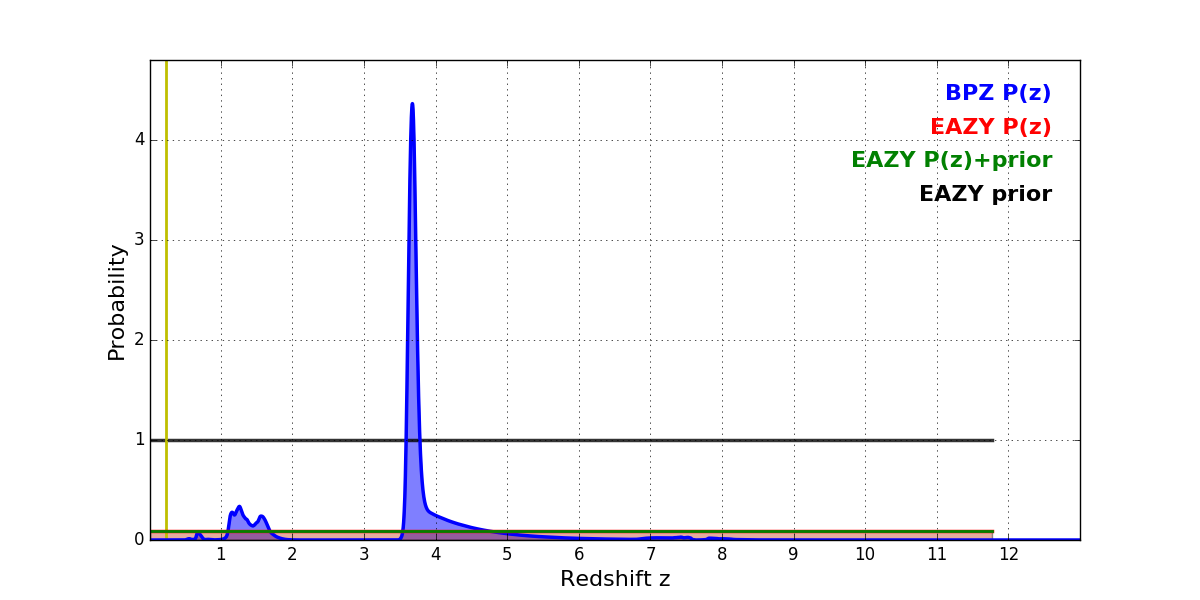 In P(z) plots: Yellow lines mark the cluster redshift z = 0.228,