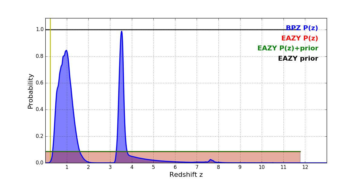 In P(z) plots: Yellow lines mark the cluster redshift z = 0.228,