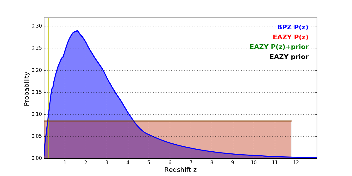 In P(z) plots: Yellow lines mark the cluster redshift z = 0.228,