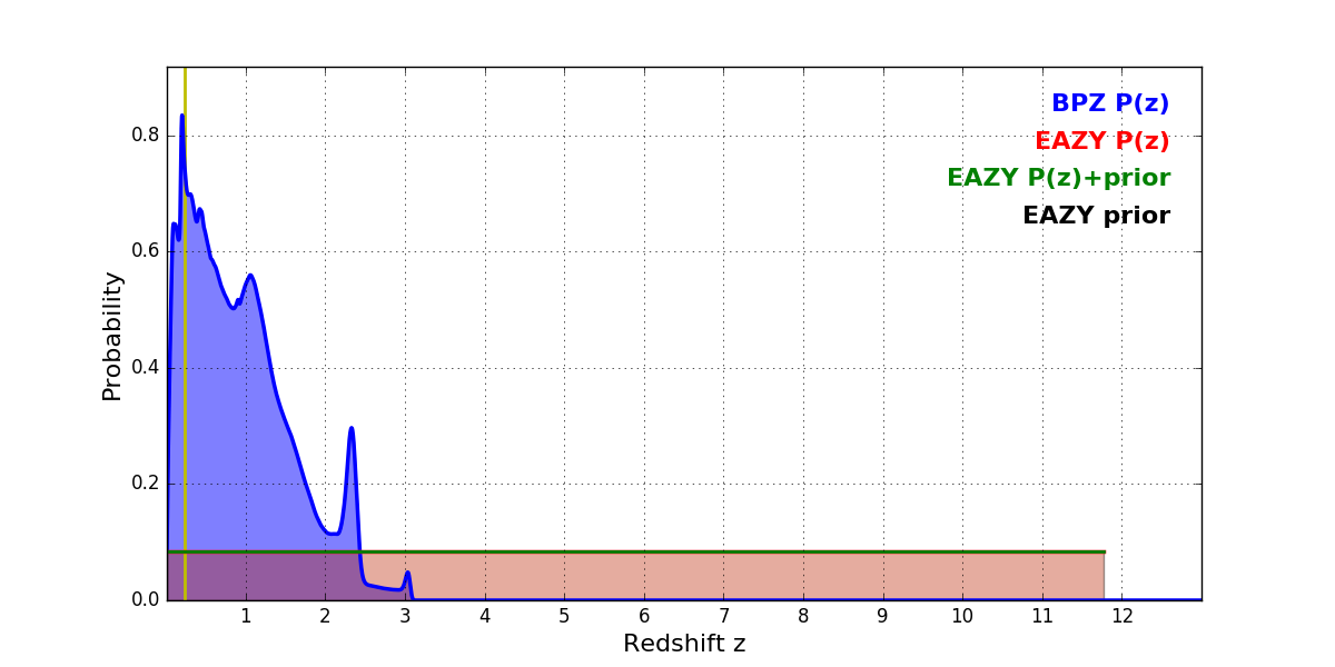 In P(z) plots: Yellow lines mark the cluster redshift z = 0.228,
